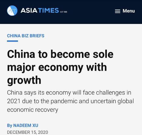 中國,是2020年全球 唯一 實現(xiàn)經濟正增長的主要經濟體。