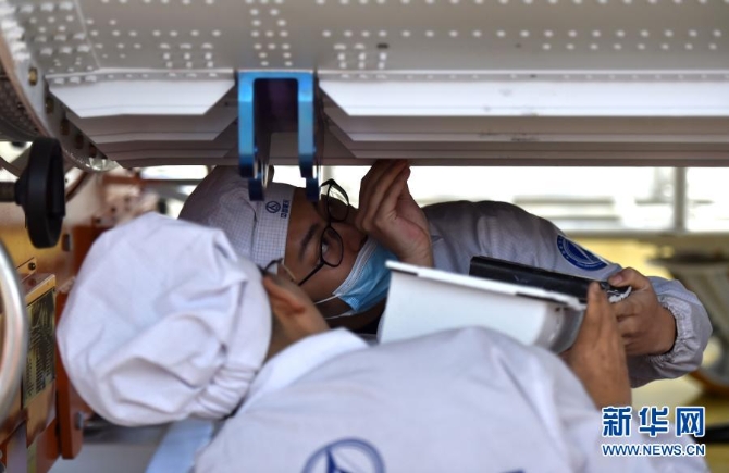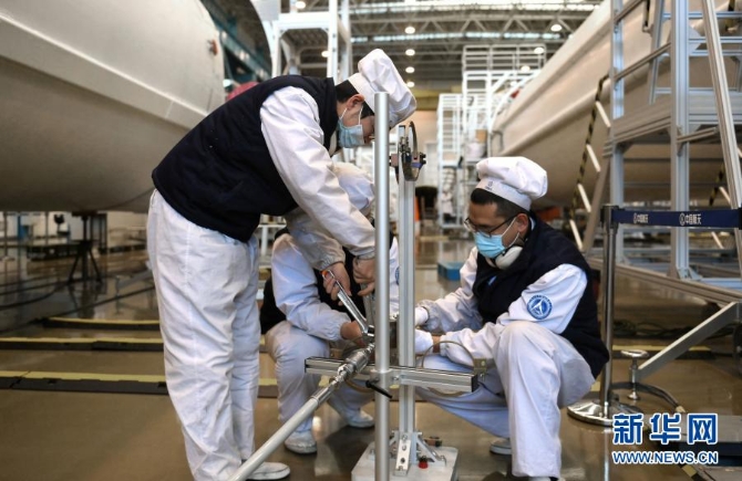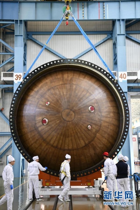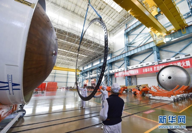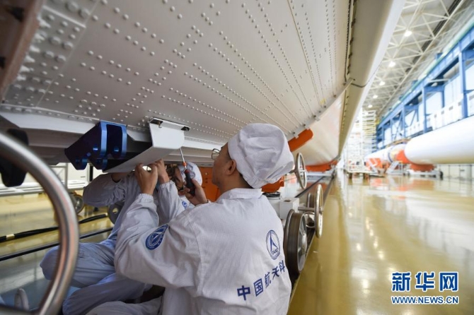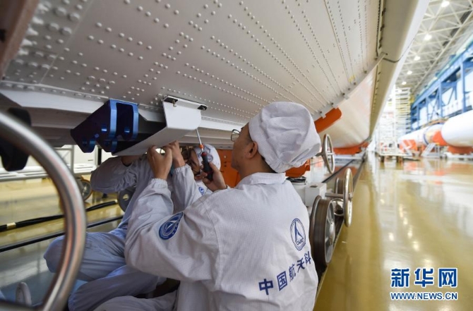 在中國航天科技集團一院天津大運載基地長征五號運載火箭總裝車間,工作人員進行相關測試工作(資料照片)。新華社發(fā)(孫凡越 攝)