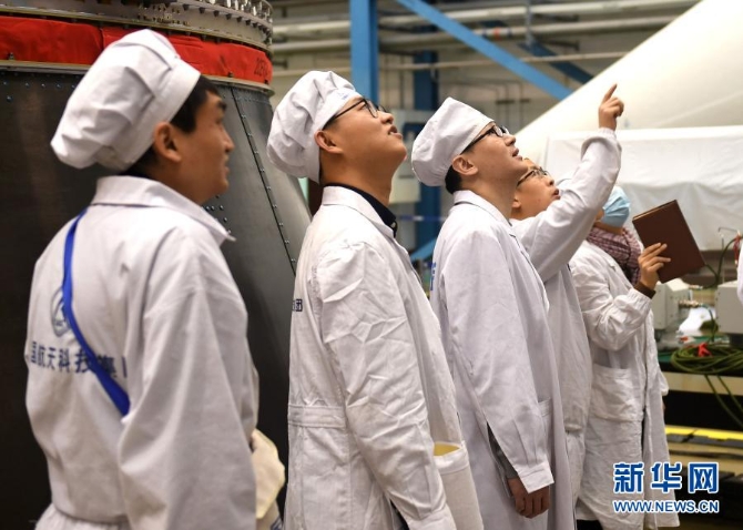 工作人員在中國航天科技集團一院天津大運載基地長征五號運載火箭總裝車間內(nèi)交流(資料照片)。新華社發(fā)(趙子碩 攝)
