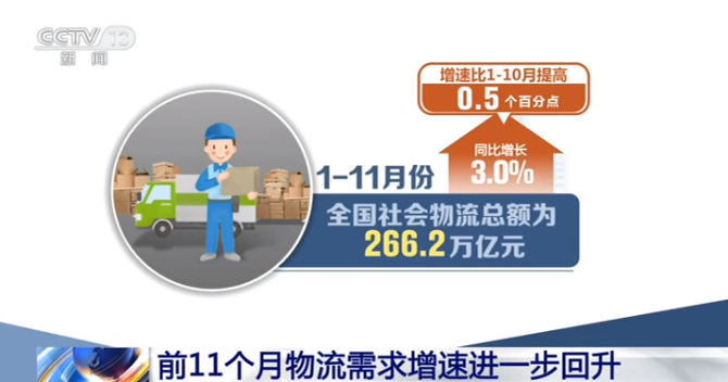 中國(guó)物流與采購(gòu)聯(lián)合會(huì)昨天(24日)公布了1—11月物流運(yùn)行數(shù)據(jù),1—11月份,全國(guó)社會(huì)物流總額為266.2萬(wàn)億元,同比增長(zhǎng)3.0%,增速比1—10月提高0.5個(gè)百分點(diǎn)。從結(jié)構(gòu)看,工業(yè)物流需求平穩(wěn)增長(zhǎng),進(jìn)口物流需求增勢(shì)良好,民生消費(fèi)相關(guān)的新動(dòng)能需求持續(xù)快速發(fā)展。具體來(lái)看,1—11月份,單位與居民物品物流總額同比增長(zhǎng)13.9%,增速比1—10月提高0.1個(gè)百分點(diǎn),連續(xù)6個(gè)月保持在10%以上。