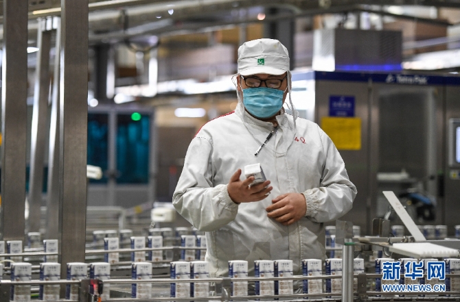 3月19日,技術(shù)人員在呼和浩特市蒙牛圣牧高科乳品有限公司的生產(chǎn)車(chē)間內(nèi)檢查產(chǎn)品的包裝情況。新華社記者 彭源 攝