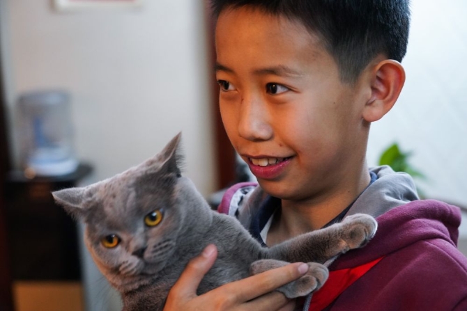 12月21日,蔡昊霖在家中與寵物貓玩耍。