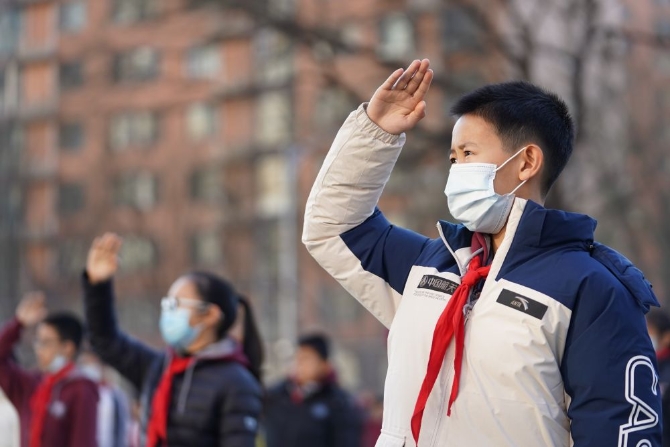 12月21日,在北京四中廣外校區(qū),蔡昊霖(前)和同學(xué)一起參加升旗儀式。