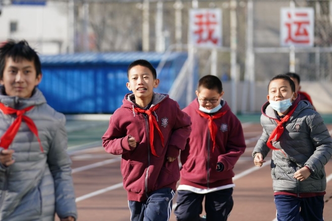 12月21日,在北京四中廣外校區(qū),蔡昊霖(左二)和同學(xué)一起上體育課。