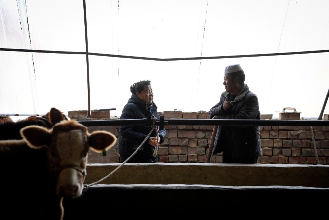 ↑丁海燕(左)走訪建檔立卡戶楊有全家,了解他今年肉牛養(yǎng)殖情況(10月28日攝)。