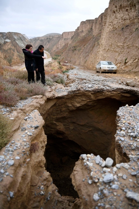 ↑在通往賀家塬村的路上,路面因?yàn)榻笛┏霈F(xiàn)大坑,丁海燕在現(xiàn)場(chǎng)觀察并讓同事及時(shí)調(diào)集鏟車處理,并告知全村人注意安全(2016年10月27日攝)。