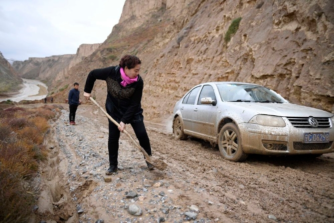 ↑在通往賀家塬村的路上,因?yàn)榻笛?路面泥濘、濕滑,車輛無(wú)法上坡,丁海燕在幫助司機(jī)鏟平道路(2016年10月27日攝)。