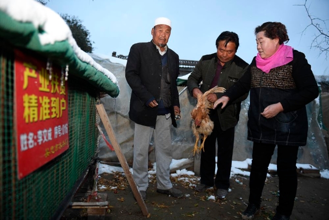 ↑丁海燕(右一)走村入戶,在貧困戶家中了解養(yǎng)殖情況(2016年10月27日攝)。