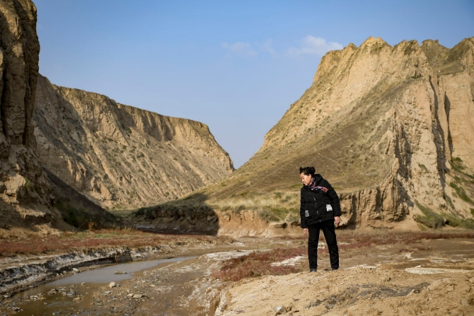 ↑賀家塬村以前沒(méi)有像樣的路,沿河溝的小路經(jīng)常被雨水沖毀。這是丁海燕走在賀家塬村的老路上(10月28日攝)。