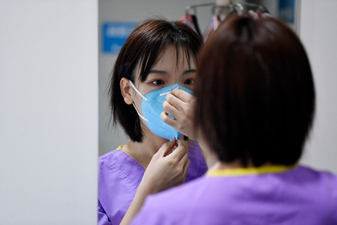 在天津醫(yī)科大學總醫(yī)院空港醫(yī)院,張碩在戴口罩準備進入“紅區(qū)”工作(12月18日攝)。