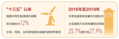 水流奔涌而下、風機呼呼轉(zhuǎn)動、光伏板熠熠生輝……“十三五”以來,我國可再生能源裝機規(guī)模年均增長約12%,水電、風電、光伏發(fā)電裝機容量均居世界首位;截至2019年,煤電裝機占全國電力總裝機容量的比例為51.95%,較2015年下降7.05個百分點。能源供應體系正由以煤炭為主向多元化轉(zhuǎn)變,可再生能源逐步成為新增電源裝機主體。