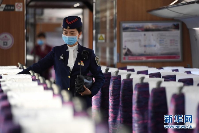 12月12日,銀川客運段列車長董芳在銀西高鐵運行試驗動車組列車上巡檢。新華社記者 陳斌 攝