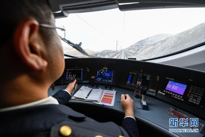 迎水橋機(jī)務(wù)段動車組司機(jī)徐銳駕駛運行試驗動車組列車行駛在銀西高鐵上(12月12日攝)。新華社記者 馮開華 攝