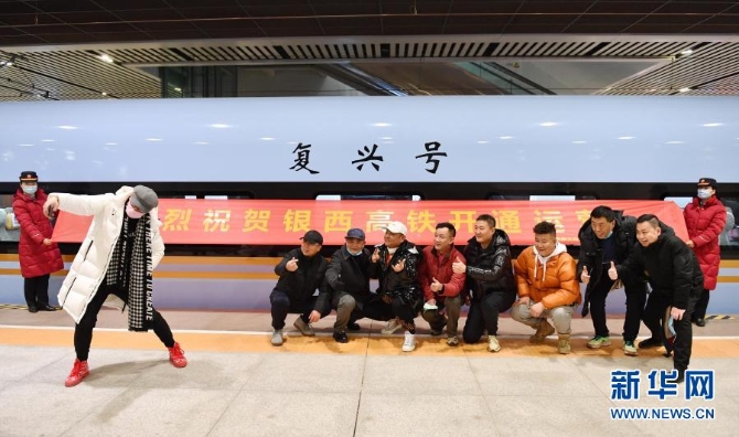 12月26日,乘客在西安北站與擔(dān)負(fù)銀西高鐵運輸任務(wù)的“復(fù)興號”動車組合影。新華社記者 張博文 攝
