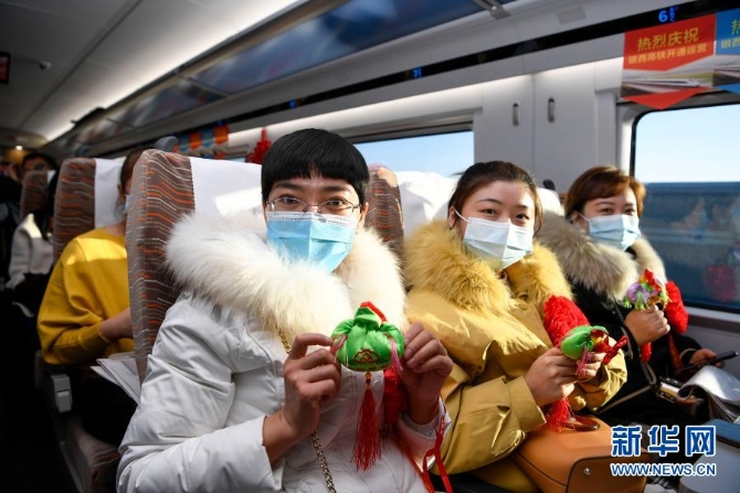 12月26日,乘坐由銀川開往西安北的D4385次列車的乘客展示獲贈的慶陽香包。新華社記者 馮開華 攝