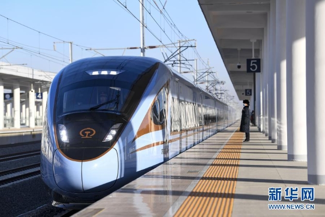 12月12日,一列運行試驗動車組列車??吭诨莅脖ぼ囌?。新華社記者 陳斌 攝