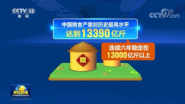 2020年,面對新冠肺炎疫情和不利天氣影響,中國糧食產(chǎn)量創(chuàng)歷史最高水平,達(dá)到13390億斤,連續(xù)六年穩(wěn)定在13000億斤以上。