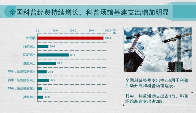 “全國科普經(jīng)費持續(xù)增長,科普場館基建支出增加明顯?!比珖破諗?shù)據(jù)統(tǒng)計負責(zé)人、科技部引智司四級調(diào)研員楊啟明介紹說,全國科普經(jīng)費支出中75.09%用于科普活動開展和科普場館建設(shè)。其中,科普場館基建支出51.64億元。2019年全國共有科技館和科學(xué)技術(shù)類博物館1477個,比2018年增加16個。全國平均每94.79萬人擁有一個科普場館。