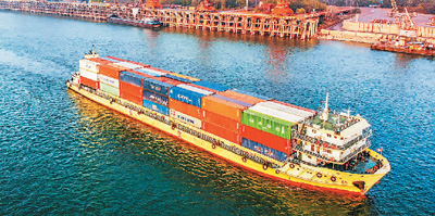 圖為近日,滿載集裝箱的貨船從長江湖北荊州港鹽卡港區(qū)起航發(fā)運。黃志剛/攝(人民視覺)