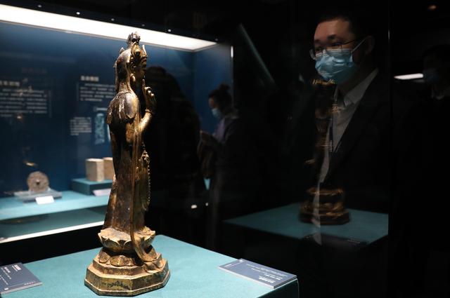 12月28日,參觀者在航海文物展上的一尊鎏金佛像展柜前駐足觀看。