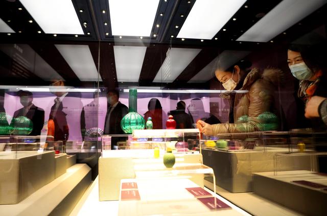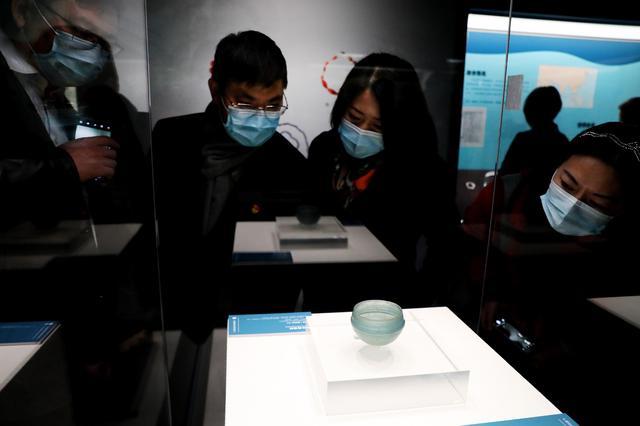 12月28日,參觀者在航海文物展上的西漢弦紋玻璃杯展柜前駐足觀看。