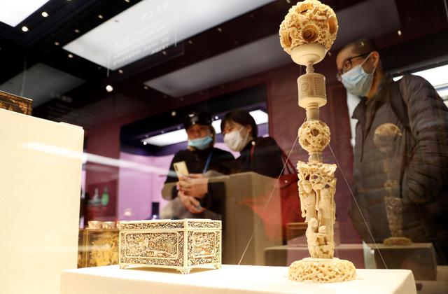 12月28日,參觀者在航海文物展上的一組雕刻工藝品展柜前駐足觀看。