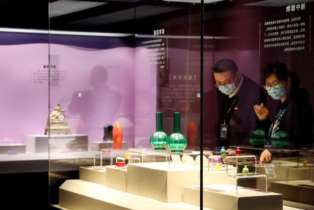 12月28日,參觀者在航海文物展上的一組琉璃制品展柜前駐足觀看。