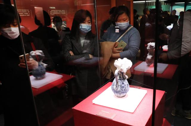 12月28日,參觀者在航海文物展上的一個元青花瓷瓶展柜前駐足觀看。