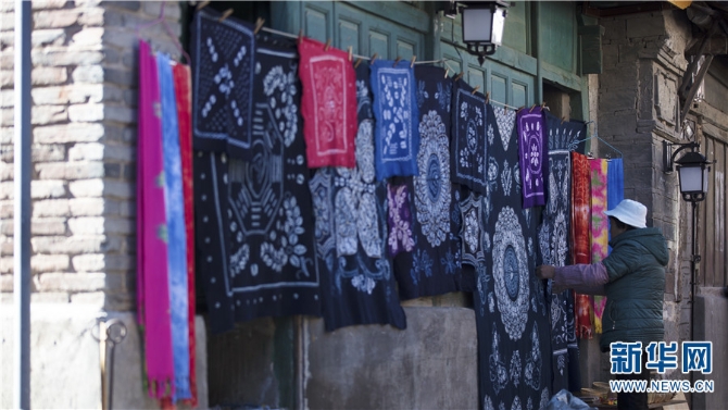 喜洲古鎮(zhèn),一位商戶正在整理掛在墻上的扎染布(12月14日攝)。新華網(wǎng) 丁凝 攝
