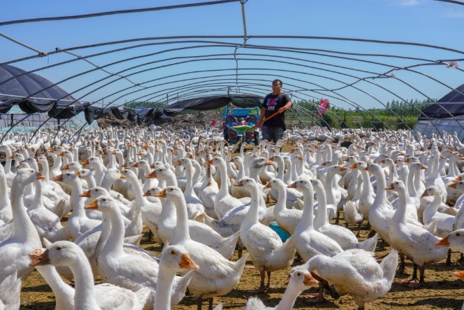 8月12日,在吉林鎮(zhèn)賚縣黑魚泡鎮(zhèn)岔臺村,村民王木堯在投喂鵝飼料。新華社記者 張楠 攝