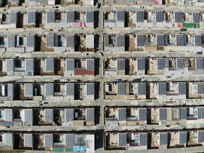 這是11月6日拍攝的青海海東市互助土族自治縣班彥新村裝有太陽能發(fā)電板的民房(無人機(jī)照片)。新華社記者 戴天放 攝