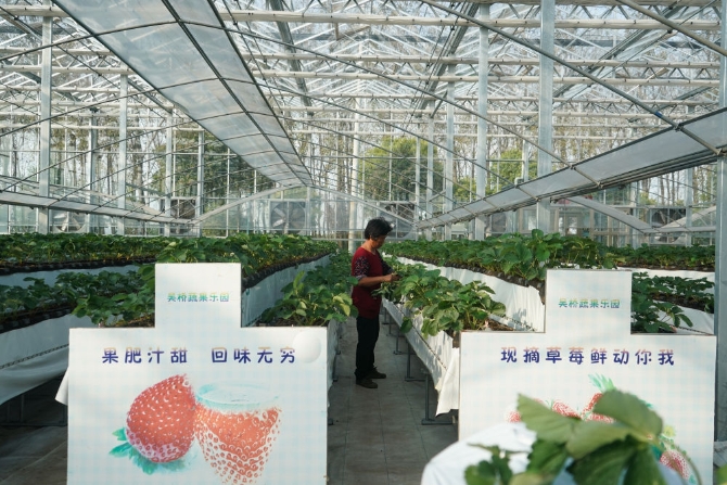 10月29日,在江蘇江都現(xiàn)代農(nóng)業(yè)產(chǎn)業(yè)園電氣化大棚,農(nóng)民在對草莓進(jìn)行日常管護(hù)。新華社記者 季春鵬 攝