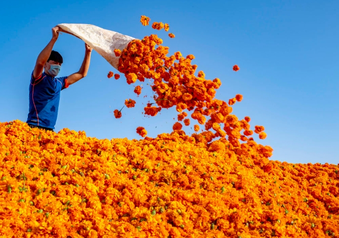 新疆于田縣的村民將稱重后的萬壽菊倒入發(fā)酵池(9月20日攝)。新華社記者 胡虎虎 攝