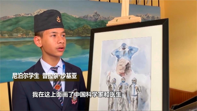 尼泊爾學(xué)生 普拉奈·沙基亞:我在這上面畫了中國科學(xué)家和醫(yī)生,他們?yōu)榱搜邪l(fā)藥品和治療病患日夜辛苦工作,我還在畫里表達了“我們一定能勝利”的信心。