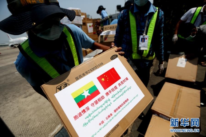 4月8日,在緬甸仰光國際機場,工作人員搬運中方捐贈的抗疫物資。中國政府派遣的抗疫醫(yī)療專家組當日抵達緬甸最大城市仰光,中方捐贈的一批防護用品、醫(yī)療設備和中成藥等抗疫物資也隨機抵達。新華社發(fā)(吳昂 攝)