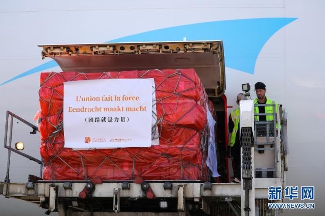 3月16日,在比利時列日機場,工作人員將口罩包裹運下飛機。來自中國的30萬只口罩當?shù)貢r間16日中午運抵比利時列日機場。這是歐洲新冠肺炎疫情暴發(fā)以來,比利時首次得到大規(guī)模外來援助。新華社記者 張鋮 攝