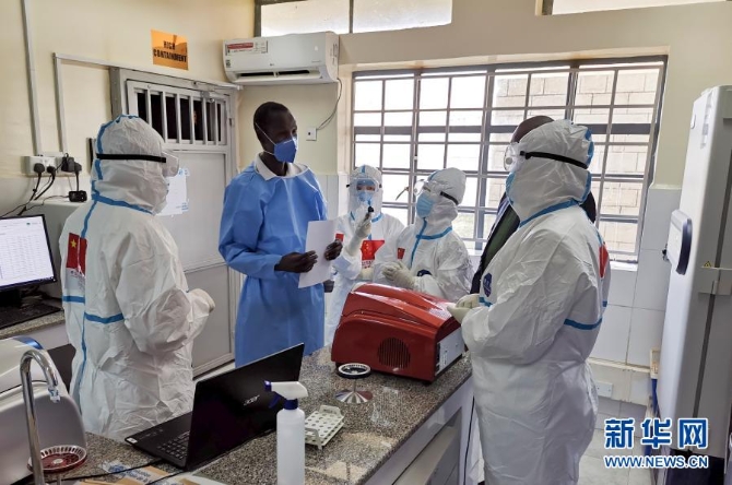 在南蘇丹首都朱巴的一處新冠病毒檢測機構,中國抗疫醫(yī)療專家組成員與南一線醫(yī)護人員交流(8月21日攝)。新華社發(fā)(中國駐南蘇丹大使館供圖)