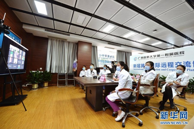 廣西醫(yī)科大學第一附屬醫(yī)院的專家通過視頻連線的方式,與柬埔寨多家醫(yī)院的醫(yī)務人員分享、交流新冠肺炎疫情防控經(jīng)驗(4月20日攝)。新華社記者 崔博文 攝