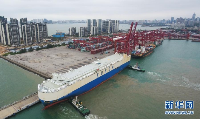 滾裝貨船“勞拉”輪駛?cè)牒?谛阌⒏?。這是海南自貿(mào)區(qū)政策實施以來的首艘汽車外貿(mào)船(2月16日攝,無人機照片)。新華社記者 楊冠宇 攝