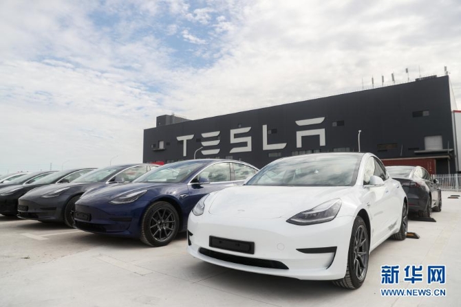 10月26日拍攝的特斯拉上海超級工廠內(nèi)的Model 3汽車。新華社記者 丁汀 攝