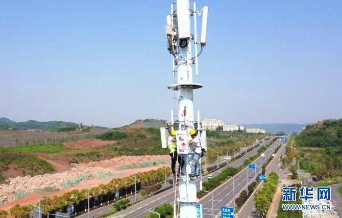 工作人員在位于重慶高新區(qū)高新大道的5G基站建設現(xiàn)場作業(yè)(4月15日攝,無人機照片)。新華社記者 王全超 攝