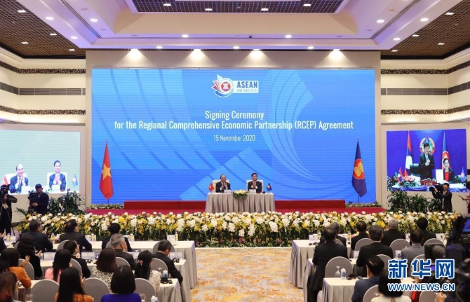 這是11月15日在越南首都河內(nèi)拍攝的區(qū)域全面經(jīng)濟伙伴關系協(xié)定(RCEP)簽署儀式現(xiàn)場。新華社/越通社