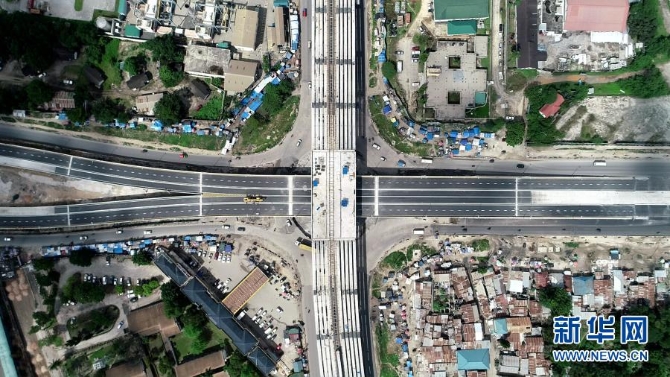 這是5月2日在坦桑尼亞達累斯薩拉姆拍攝的建設中的烏本戈立交橋項目。烏本戈立交橋是坦桑尼亞政府主導的第一個立交橋項目,主要由一座三層立交橋和配套分流道路構成,由中國土木工程集團東非有限公司承建。新華社發(fā)