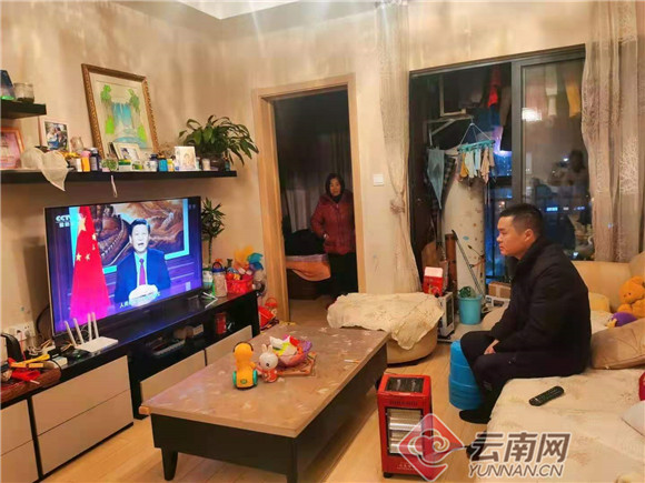 昆明順通社區(qū)居民王倩觀看聆聽(tīng)習(xí)近平主席新年賀詞直播。供圖