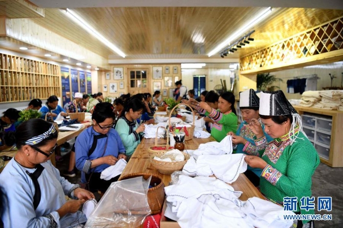 少數(shù)民族婦女在貴州省榕江縣臥龍易地扶貧搬遷安置小區(qū)千匠百藝扶貧車間就業(yè)(2020年5月20日)。2020年11月23日,貴州省人民政府宣布,全省剩余9個未摘帽的貧困縣全部退出貧困縣序列。至此,貴州省貧困縣全部出列。新華社發(fā)(王炳真 攝)