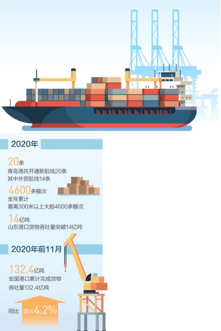 政策給力,更要發(fā)揮優(yōu)勢(shì)乘勢(shì)而上。在地理位置上,山東港口青島港是“一帶一路”上重要的節(jié)點(diǎn)城市、沿黃流域多省份的“出??凇保欣诮ㄔO(shè)東北亞航運(yùn)樞紐中心。2020年,山東港口青島港總共開通新航線20條,其中外貿(mào)航線14條。