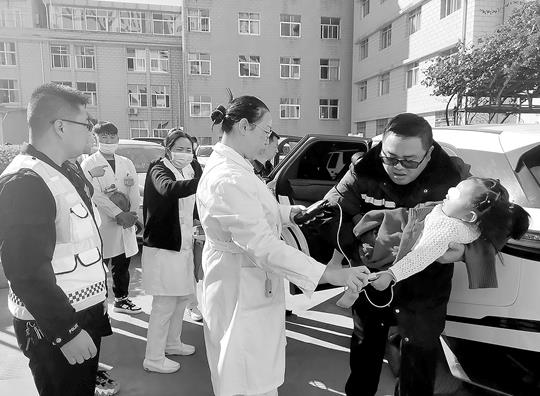 1月1日,昌寧縣一名2歲幼女隨父母外出時(shí)突發(fā)疾病出現(xiàn)昏迷。危急時(shí)刻,保山市公安局隆陽區(qū)交警大隊(duì)民警迅速出警趕往匯合地,用警車開道,護(hù)送患兒安全送達(dá)醫(yī)院僅用了10分鐘,為其打通了生命通道。