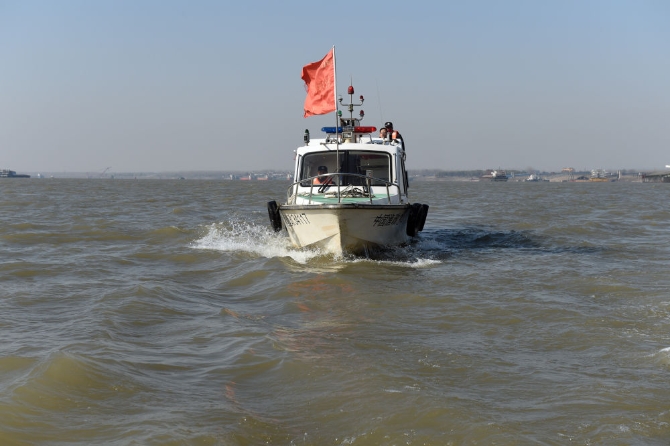 2020年12月16日,在安徽省安慶市,安慶江豚巡護(hù)隊的隊員們駕船在長江上巡視。新華社記者 周牧 攝