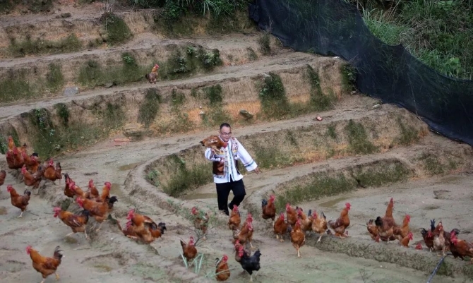 △2020年5月20日,在廣西柳州融水苗族自治縣大浪鎮(zhèn)上里村,第一書記楊崛拿著當?shù)仞B(yǎng)殖的土雞準備直播。