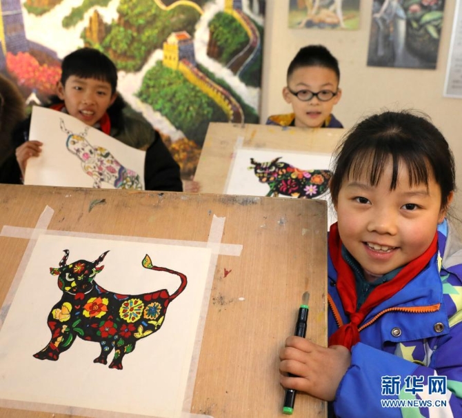 當(dāng)日,諸暨市陶朱街道三都小學(xué)美術(shù)社團(tuán)的學(xué)生來到三都農(nóng)民畫館,在當(dāng)?shù)剞r(nóng)民畫家的指導(dǎo)下參觀農(nóng)民畫展,了解農(nóng)民畫的特點(diǎn),并學(xué)習(xí)用農(nóng)民畫的技法畫生肖牛。